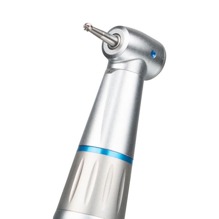 Das blaue Winkelstück erzeugt eine vertretbare Lautstärke von ≤ 70 dB. Die Kühlmedien sind bei diesem Winkelstück innenliegend. Der Winkelstück-Kopf kann bei diesem Modell schnell und komfortabel durch das Drehen eines Ringes ausgetauscht werden. Das Winkelstück verfügt über einen Druckknopf zum schnellen Auswechseln der Präparationswerkzeuge. Die Reinigung und Sterilisation kann bequem über die Verwendung von Autoklaven oder Thermodesinfektoren erfolgen.