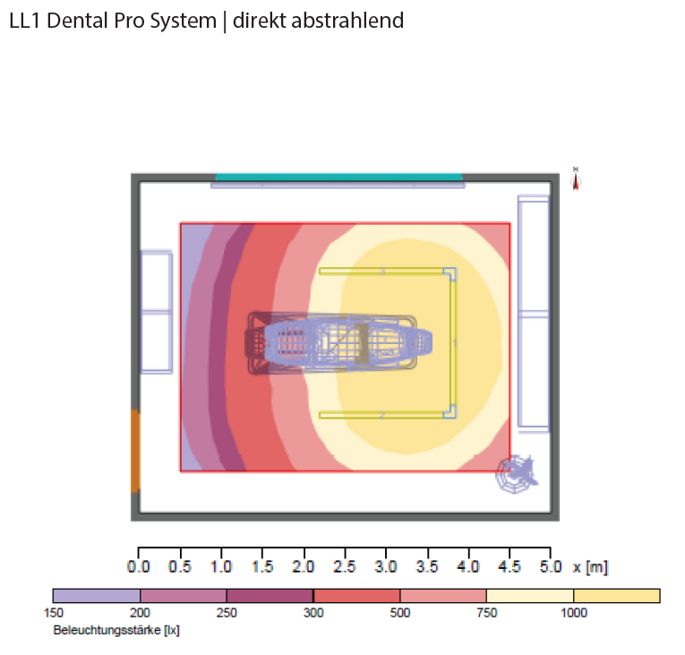 Gemäß DIN EN ISO 9680 gehören geeignete Behandlungsleuchten zur Standardausrüstung jeder Zahnarztpraxis. Die verwendete LED-Technik mit einem Farbwiedergabeindex von CRI >90 gewährleistet eine optimale Qualität restaurativer Arbeiten, da Zahn- und Gewebefarbtöne bestmöglich erkannt und angeglichen werden können. Durch den Einsatz von kegelentblendeten CDP-Prismendiffusoren der Firma Jungbecker wird eine maximale Blendungsreduktion erreicht. Die direkt abstrahlende Variante eignet sich besonders für niedrige Raumhöhen, während die direkt/indirekte Systemvariante bei Raumhöhen von 2,5 m und mehr eine gleichmäßigere Ausleuchtung und ein angenehmeres Lichtempfinden für die Patienten bietet.