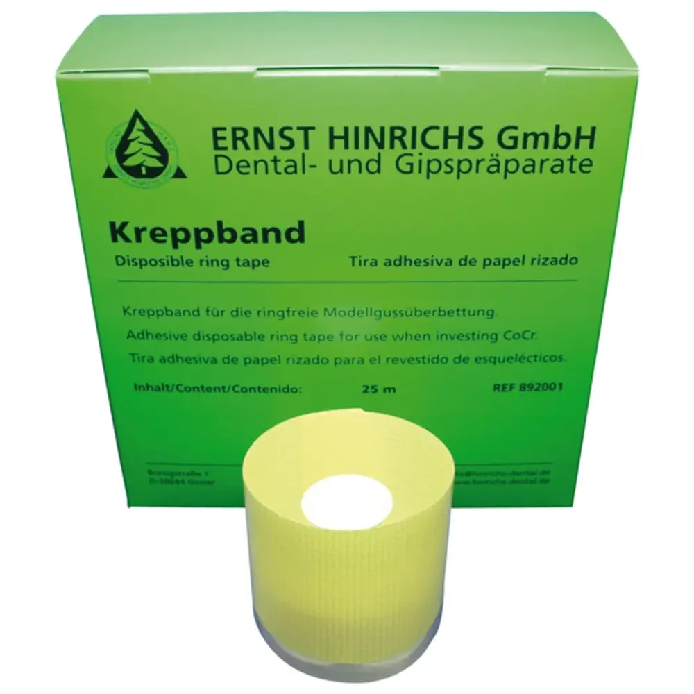 Das ERNST HINRICHS Kreppband ist die ideale Lösung für das ringfreie Herstellen der Modellgussüberbettung in Verbindung mit der küvettenfreien Dubliertechnik von ERNST HINRICHS. Mit einer Länge von 25 m bietet es ausreichend Material für zahlreiche Anwendungen in der Zahntechnik.