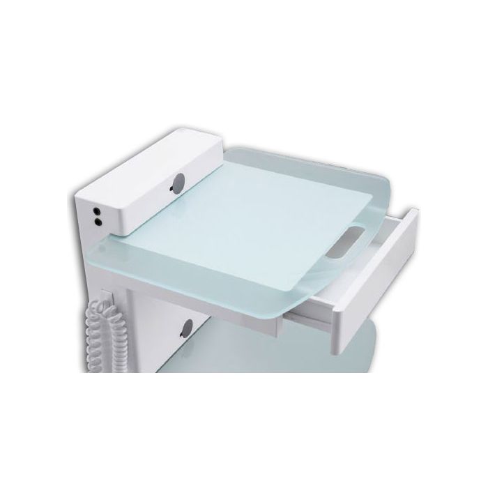 Produktinformationen "Großer chirurgischer Rollwagen mit 2 Glasablageflächen, 1 Schublade und 3 Steckdosen"