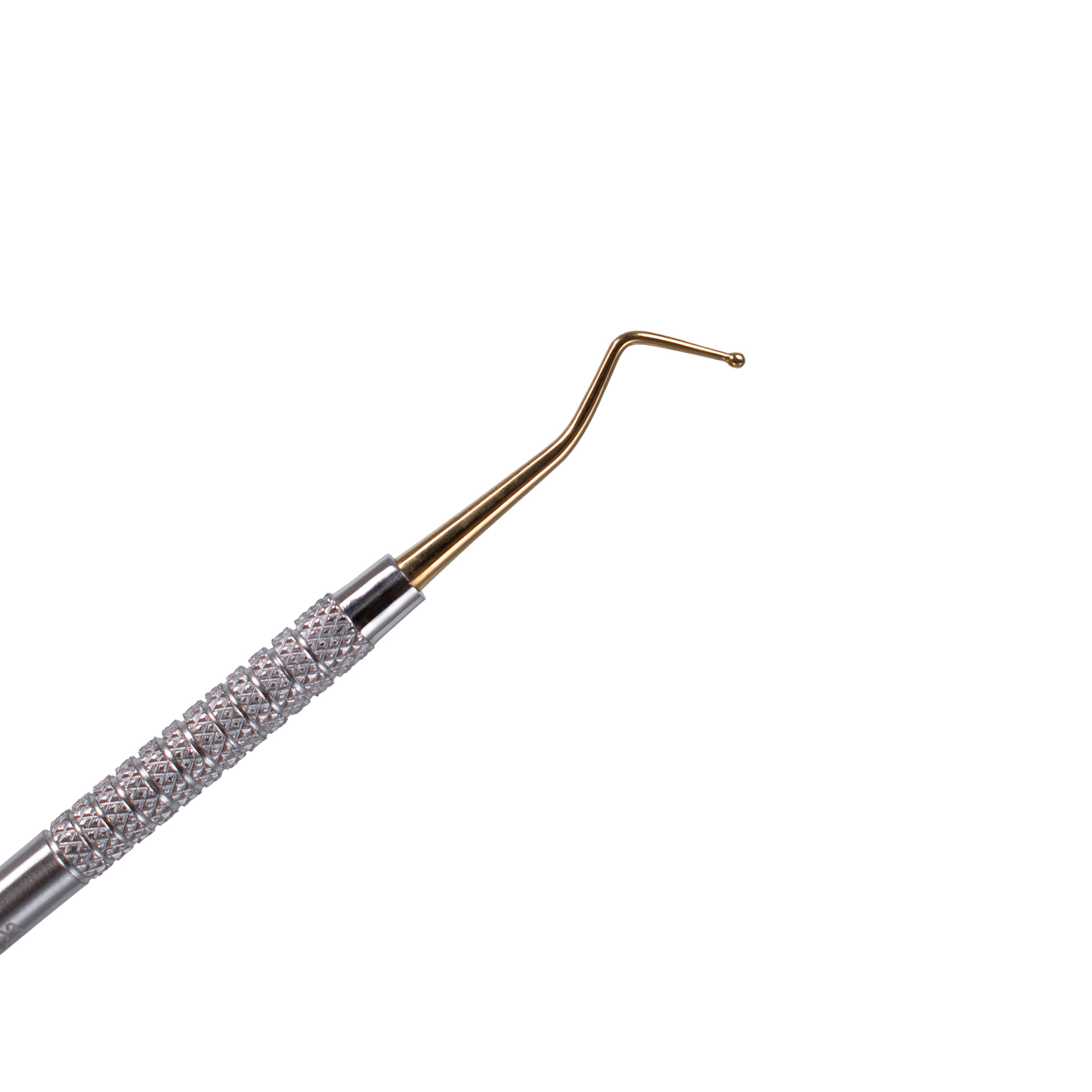 Der Kugelstopfer verfügt über zwei kugelförmige Enden in unterschiedlichen Größen, die es ermöglichen, Composite-Materialien präzise in die betroffene Stelle einzubringen, zu glätten und zu formen. Sie können das passende Ende auswählen, das optimal zur Kavität passt. Der geriffelte Schaft sorgt zudem für einen sicheren Halt und eine komfortable Handhabung während der Behandlung.
