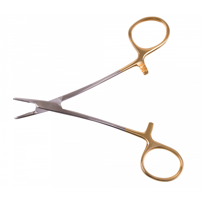 Der Nadelhalter ist gerade, glatt und mit einem Schloss versehen. Dieses chirurgische Instrument ist mit Hartmetalleinsätzen aus Wolframcarbid versehen. Erkennbar an den goldenen Ringen. Durch den Einsatz dieses Hartmetalls wird eine bis zu 30-fach längere Haltbarkeit und Stabilität erreicht. Das Instrument ist für die heiße und kalte Sterilisation geeignet.