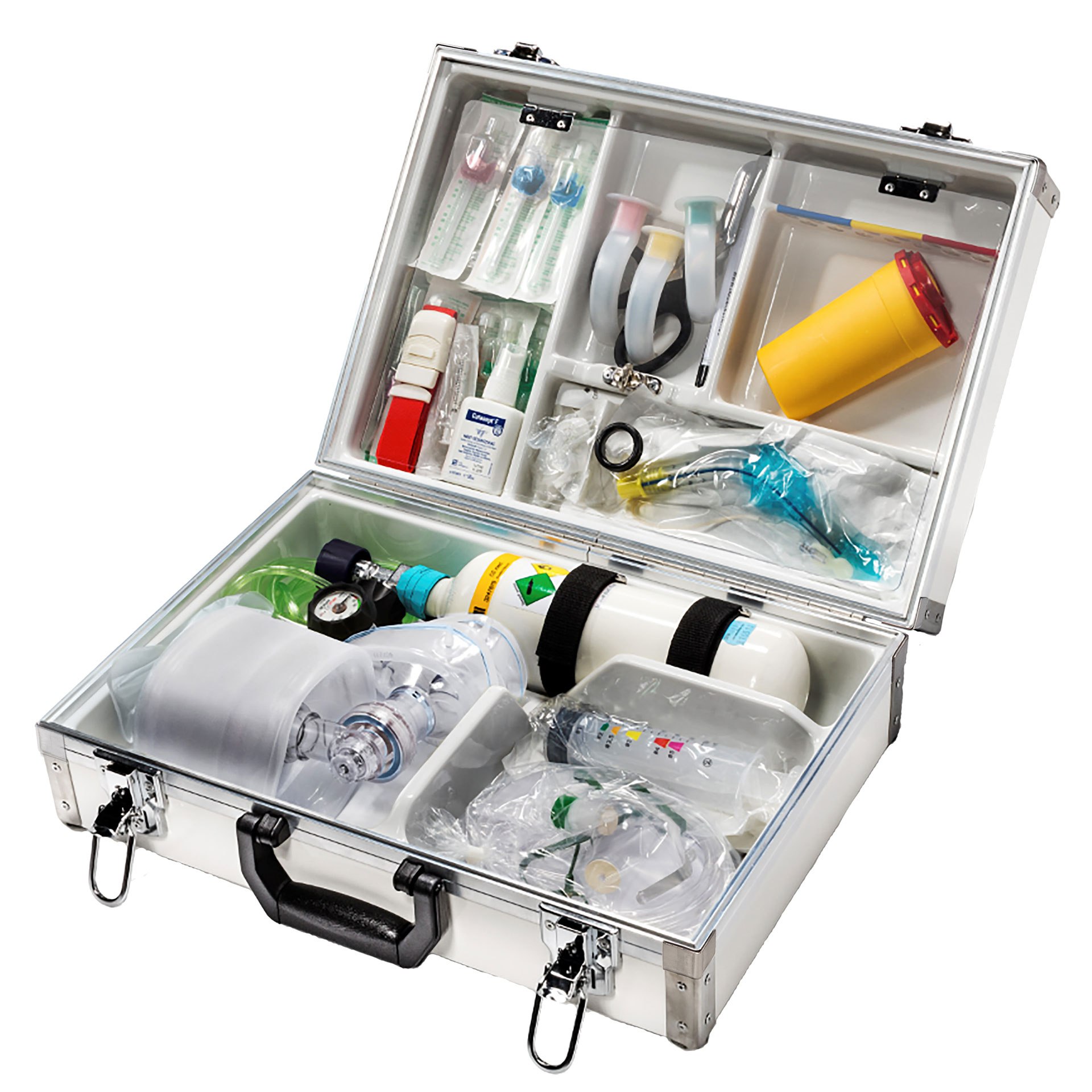 Die hygienisch abgerundete Inneneinrichtung ermöglicht ein einfaches, schnelles und gründliches reinigen. Da der Notfallkoffer aus Aluminium ist, wird Stabilität mit Leichtigkeit kombiniert. Er bietet viel Platz für die Notfallausrüstung und hat 15 integrierte Steckplätze für Ampullen. Eine Halterung für eine 1 Liter Sauerstoffflasche ist vorhanden.