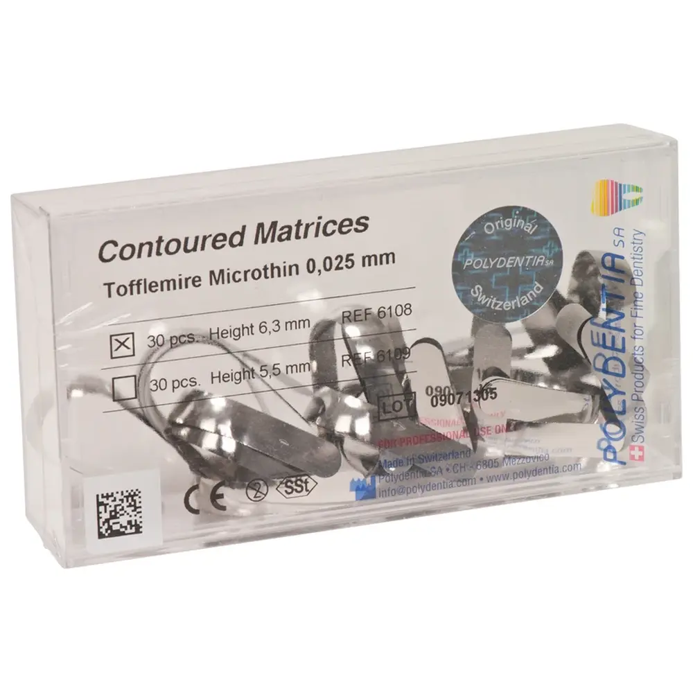 Die Polydentia SA Matrizen nach Tofflemire bombiert sind speziell für die Anforderungen in der Zahnmedizin entwickelt worden und bieten eine exzellente Lösung für die Erstellung von Füllungen. Mit ihrer anatomisch vorgeformten Struktur und der hohen Präzision sind sie ideal für eine Vielzahl von zahnmedizinischen Anwendungen geeignet.