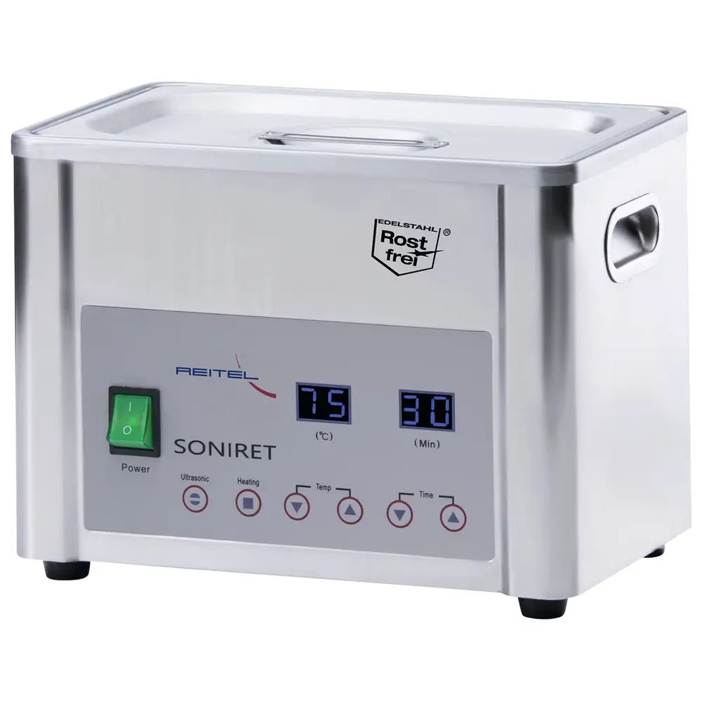 Ultraschallreinigung bietet sich für die unterschiedlichsten Materialien an. Fertigungsteile, die keine hohen Temperaturen aushalten, lassen sich mit Ultraschall reinigen. Selbst schwierig erreichbare Stellen werden durch die Druck und Sogwellen erzeugten Bläschen gesäubert. Die Ultraschall-Reinigung wird auf Wunsch durch die leistungsstarke Heizung verstärkt. Der hochwertige Edelstahl-Behälter und -Gehäuse ist resistent gegen viele Säuren und Laugen und ermöglichen den Einsatz verschiedenster Reinigungs-Chemikalien, falls die alleinige Wirkung der leistungsstarken Ultraschall-Erzeuger nicht ausreichen sollte. Der zum Gerät gehörende Edelstahl-Deckel verhindert das Ausgasen der Flüssigkeiten und Geruchsbelästigung in Ihrer Fertigungsstätte. Ob verschiedenste Metall-Legierungen, Kunststoffe oder Keramiken – reinigen Sie sie mit dem SONIRET.Technische Details Schneller Instrumentenumlauf Zeitverkürzte Desinfektion Temperaturbereich von 20 bis 80 °C Einschaltzeit von 1 bis 99 Minuten einstellbar Wanneninhalt max. 3 l