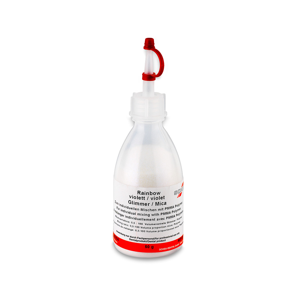Der SCHEU-DENTAL Glimmer Rainbow Violet ist die perfekte Ergänzung für Deine individuellen Mischungen mit STEADY-RESIN und DURASPLINT. Mit dieser hochwertigen Glimmer-Variante kannst Du kreative und einzigartige Effekte in Deinen dentalen Anwendungen erzielen.