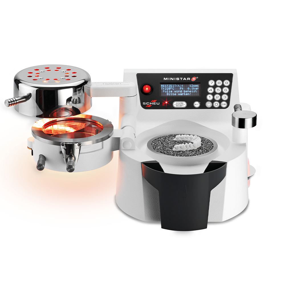 Das SCHEU-DENTAL MINISTAR S 230 V ist ein kompaktes Druckformgerät, das mit modernster Scan-Technologie ausgestattet ist. Der integrierte Scanner liest die codierte Tiefziehfolie ein und programmiert automatisch alle wichtigen Parameter wie Heizzeit, Temperatur und Abkühlzeit. In Kombination mit dem ultraschnellen, patentierten Strahler und einem maximalen Arbeitsdruck von 4 bar, der über einen Druckminderer am Gerät justierbar ist, erzielt das MINISTAR S präzise Tiefziehergebnisse in Rekordzeit.