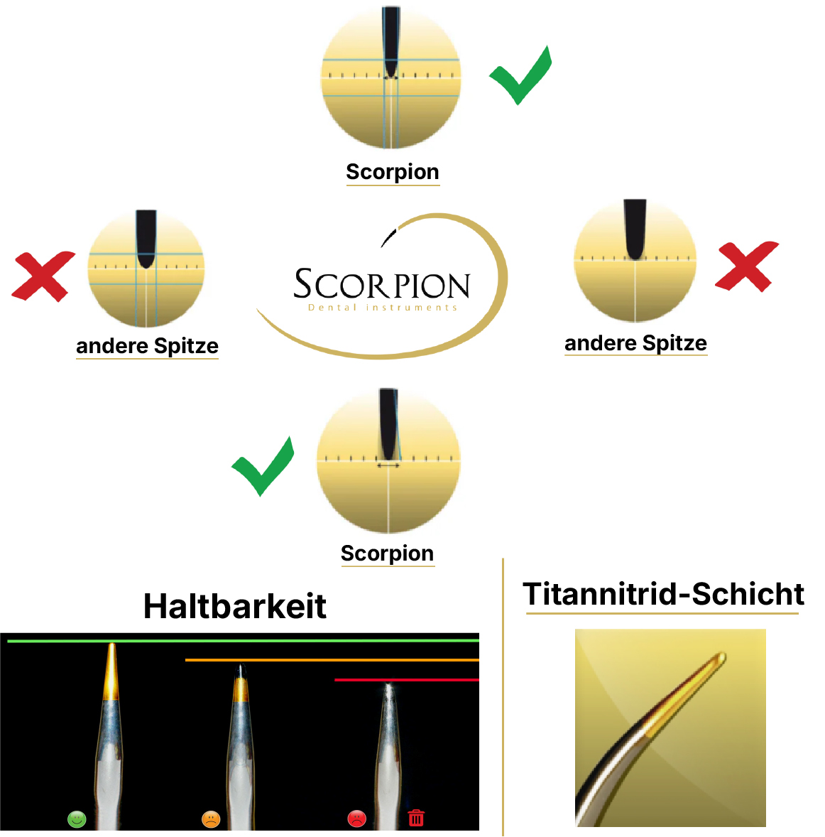 Die universelle Spitze ermöglicht nicht nur ein effektives Scaling, sondern ist auch mit einem Titan-Nitrid-Verschleißindikator ausgestattet, der dir hilft, den Zustand der Spitze im Blick zu behalten. Der sehr dünne und leistungsstarke Spitzenpunkt sorgt für präzise Ergebnisse und eine sanfte Behandlung. Zudem kann der Scorpion Scaling Tip auch mit dem Scorpion CLiP verwendet werden, um Implantate und Restaurationen gründlich zu reinigen, dank seines speziellen und patentierten Spitzenpunkts.