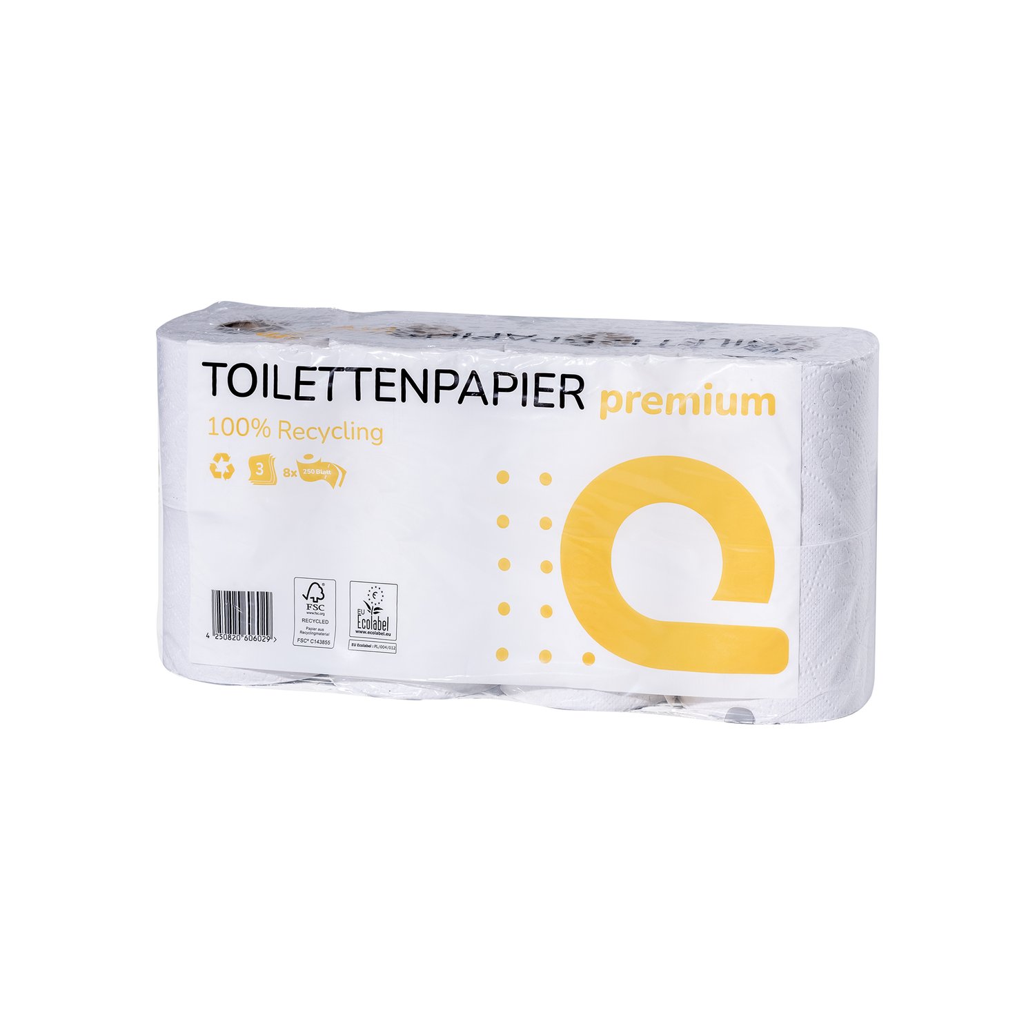 Toilettenpapier Kleinrolle, 3-lagig, 250 Blatt, 8x8 Rollen, Recycling, FSC Recycled 100%