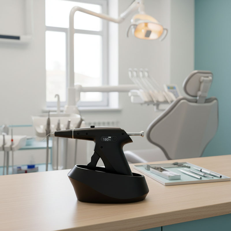 Das Fi-P Obturationsgerät überzeugt durch eine extrem kurze Aufwärmzeit von nur 0,2 Sekunden, sodass es sofort einsatzbereit ist. Die vorgekrümmte Spitze mit einem Durchmesser von 0,35 mm ermöglicht eine präzise Anwendung, während die vier einstellbaren Arbeitstemperaturen eine exakte Anpassung an unterschiedliche Materialien gewährleisten. Dank der hochpräzisen Temperaturregelung bleibt die Temperatur konstant, was die Sicherheit und Effektivität der Behandlung erhöht.