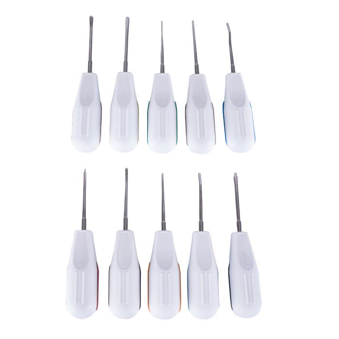 Die Garnitur beinhaltet zehn Heber mit unterschiedlichen Spitzenformen aus korrosionsbeständigem Edelstahl. Die ergonomischen Kunststoff-Griffe ermöglichen eine ermüdungsfreie, präzise Handführung. Jeder Heber ist zur besseren Unterscheidung farblich gekennzeichnet. Die Instrumente sind autoklavierbar und erfüllen die Hygieneanforderungen einer modernen Zahnarztpraxis.