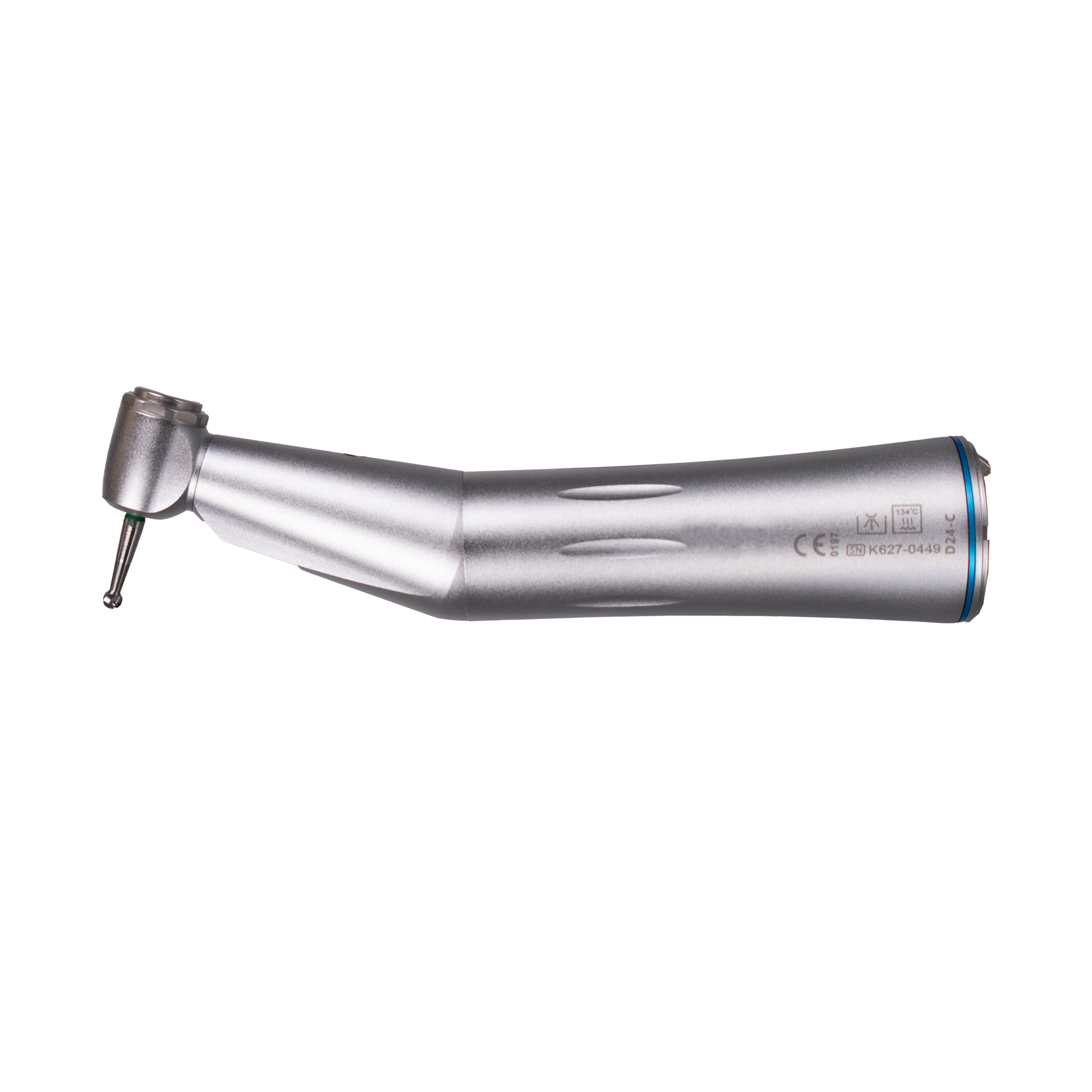 Die Lichtleiterquelle gewährleistet eine hervorragende zielgerichtete Ausleuchtung des zu präparierenden Bereiches. Mit einer Umdrehungszahl von ~ 25.000 Umdrehungen pro Minute entspricht unser blaues Winkelstück allen Anforderungen, die an ein Winkelstück gestellt werden. Die Kühlung des präparierten Bereiches erfolgt über die innenliegenden Kühlmedien mittels effektiver 1-Loch-Sprüh-Kühlung.