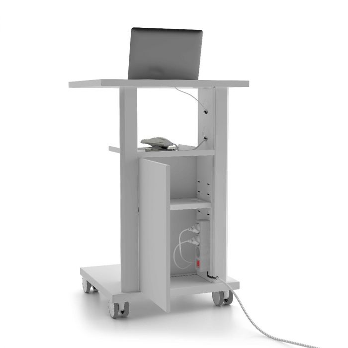 Die verdeckte Kabelführung in Verbindung mit der integrierten Dreifachsteckdose erleichtert die ordentliche Verkabelung Ihres Equipments in diesem Praxis-Rollwagen. Zusätzliche Geräte für die Diagnostik oder Patientenberatung lassen sich bei installierter Frontplatte auch im Innenraum des PC-Rollwagens oder einfach griffbereit auf einer der Ablageflächen platzieren.