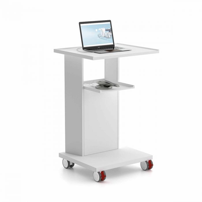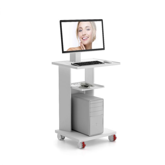 Dieser äußerst funktionale PC-Rollwagen wurde speziell für den mobilen Einsatz von Computern und weiterem Equipment in einer Praxis entwickelt. In Verbindung mit einer Intraoralen Kamera und einem PC eignet sich der Multifunktionswagen beispielsweise hervorragend als flexible und mobile Diagnostikstation und für die Patientenberatung.